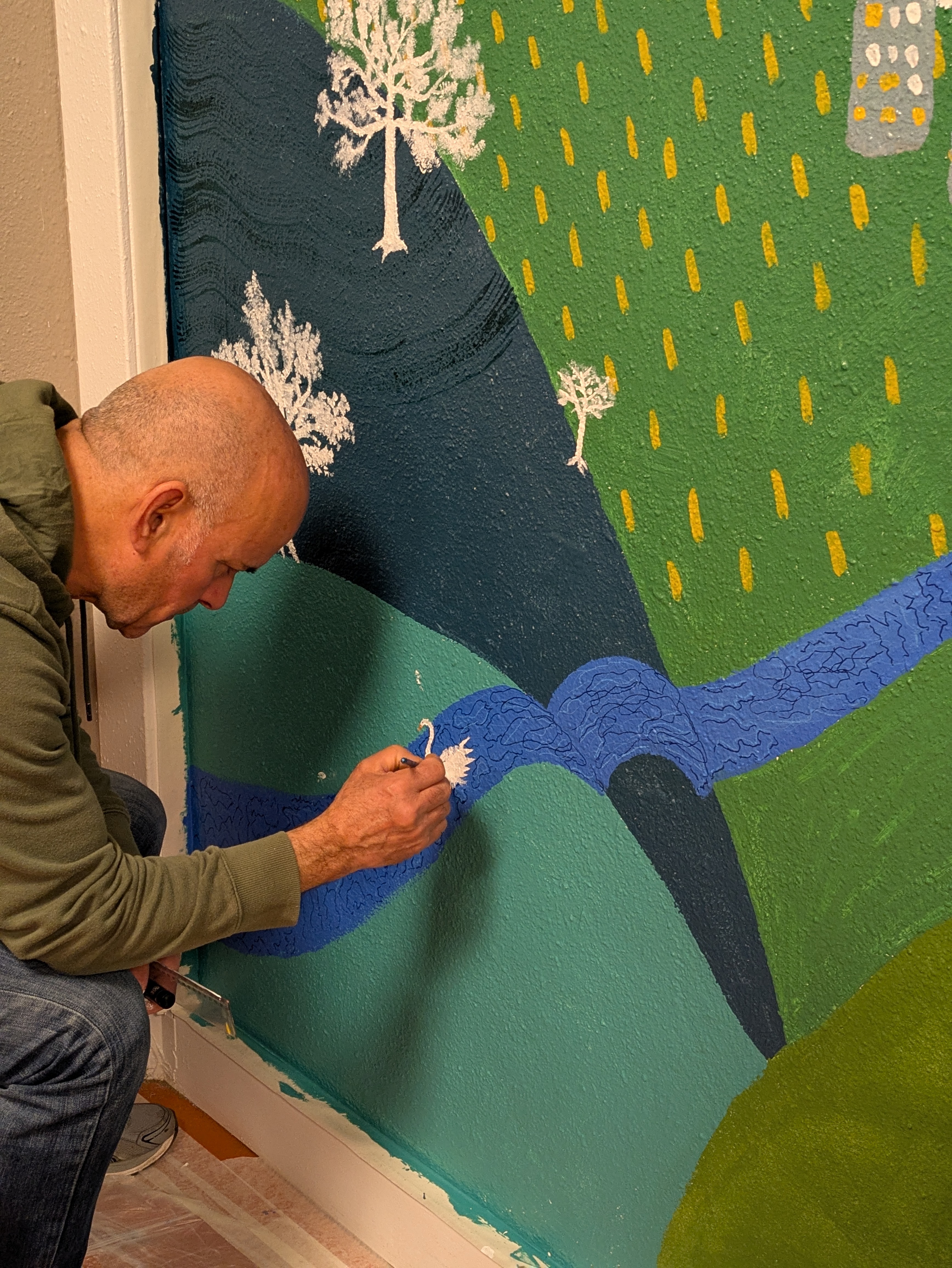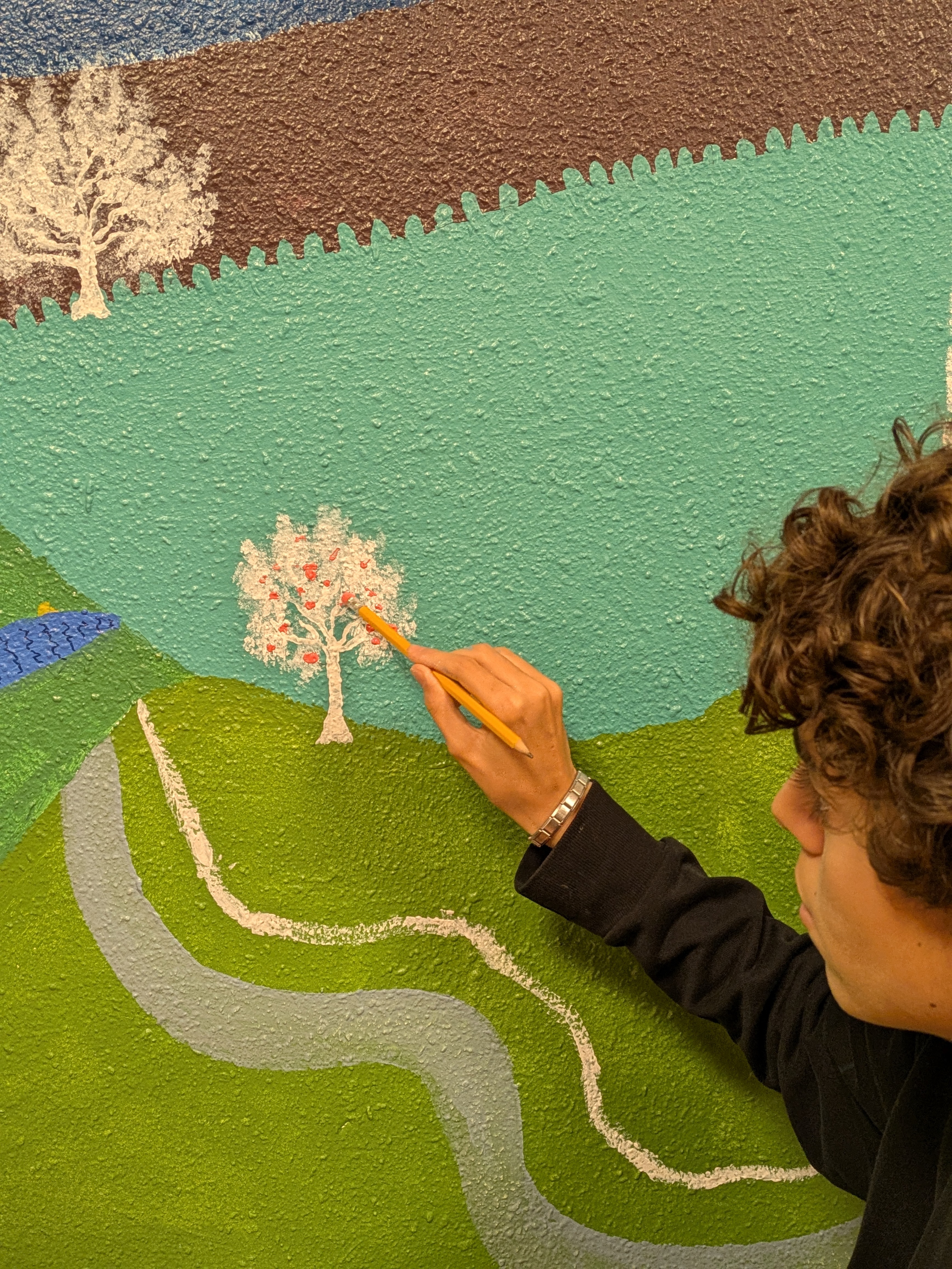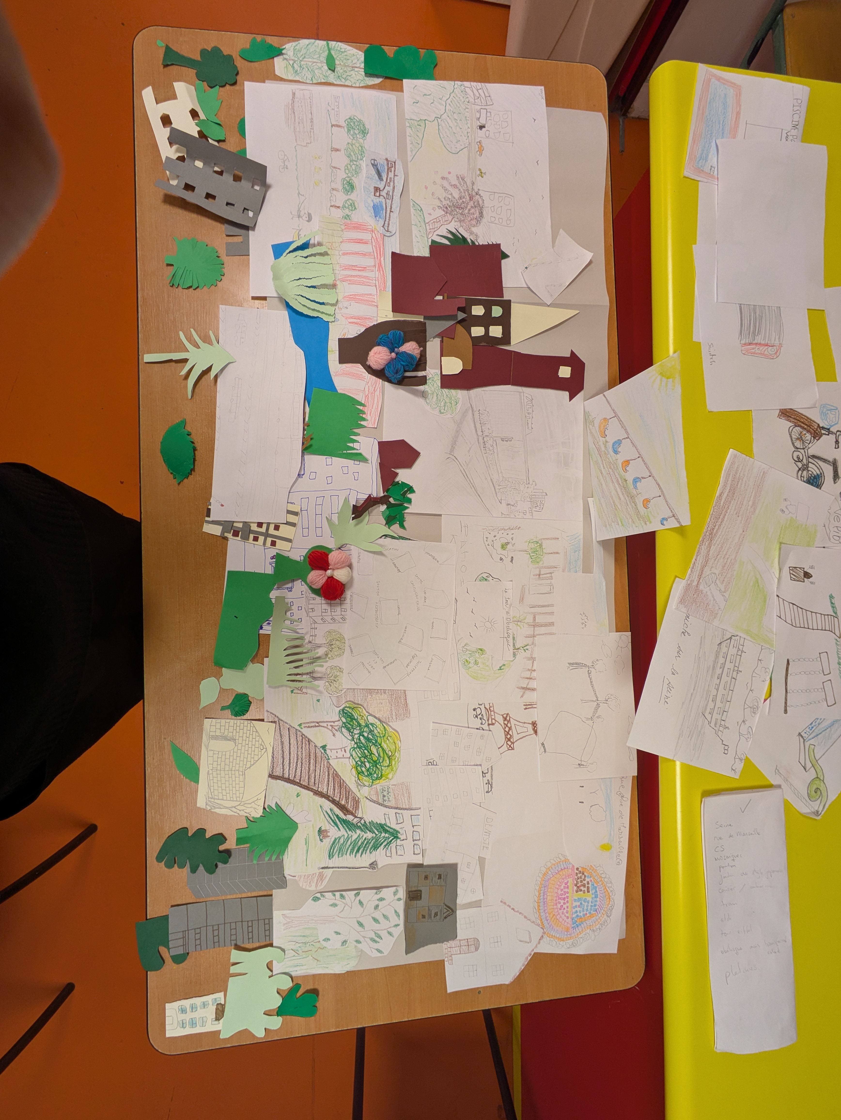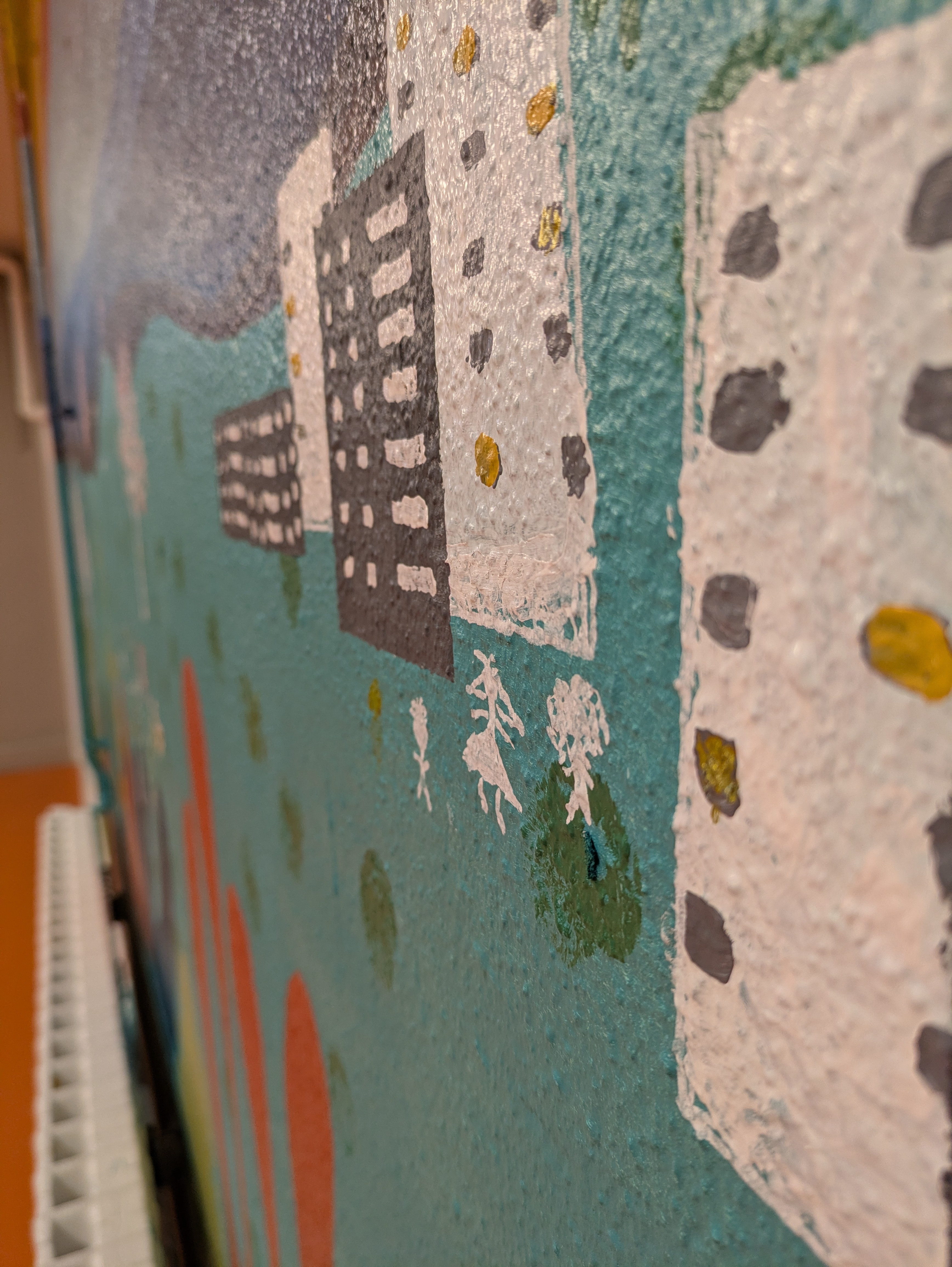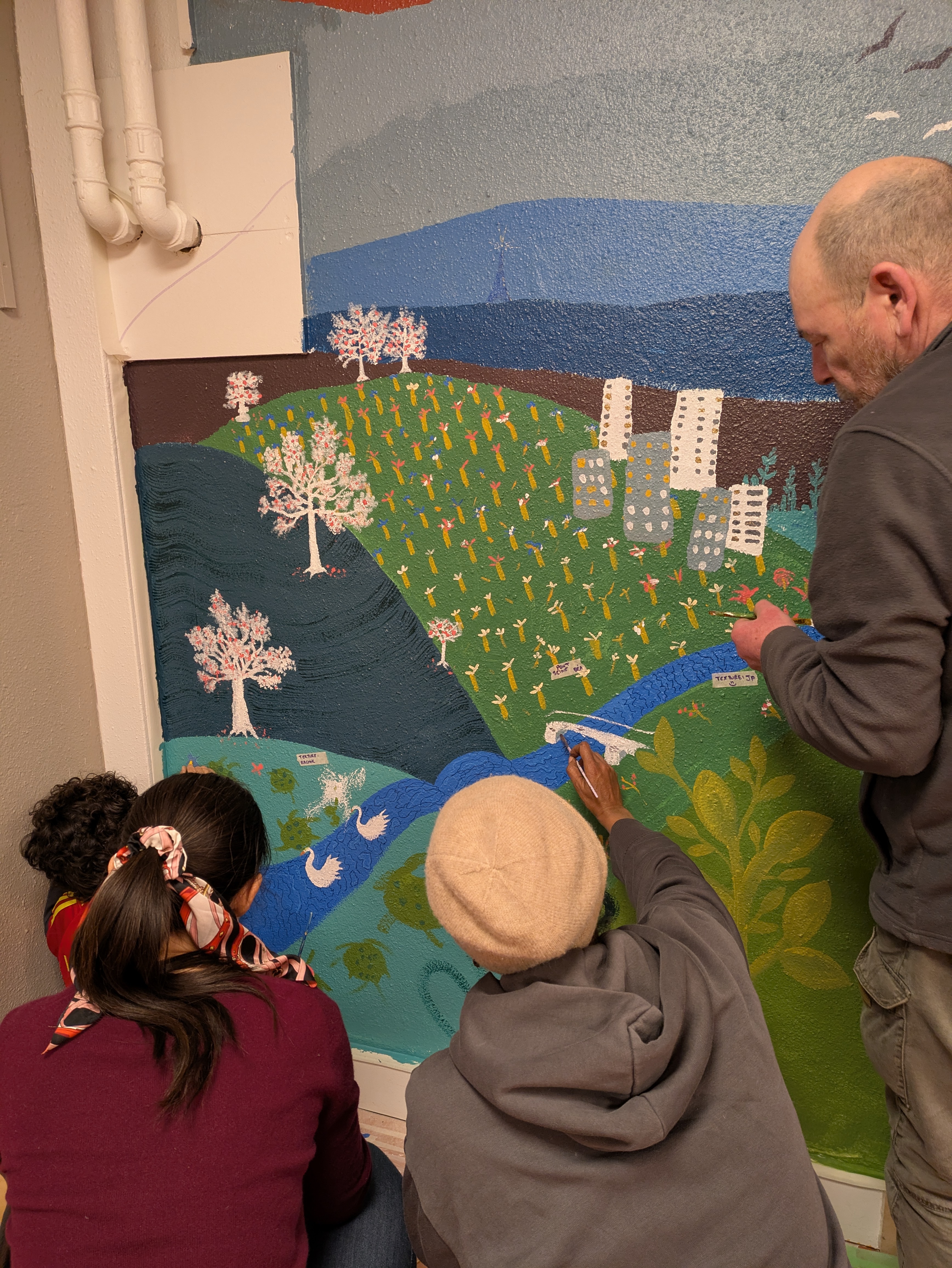 La fresque a ensuite été réalisée collectivement, de la maquette à l’échelle réduite jusqu’à la peinture murale. Grands aplats, détails, superpositions et finitions ont donné lieu à une collaboration active, où chacun·e a pu trouver sa place, affirmer son geste et dialoguer avec ceux des autres L’œuvre finale témoigne d’une vision partagée du quartier : à la fois réelle et rêvée, construite dans la diversité des regards et l’expérience du faire ensemble.
