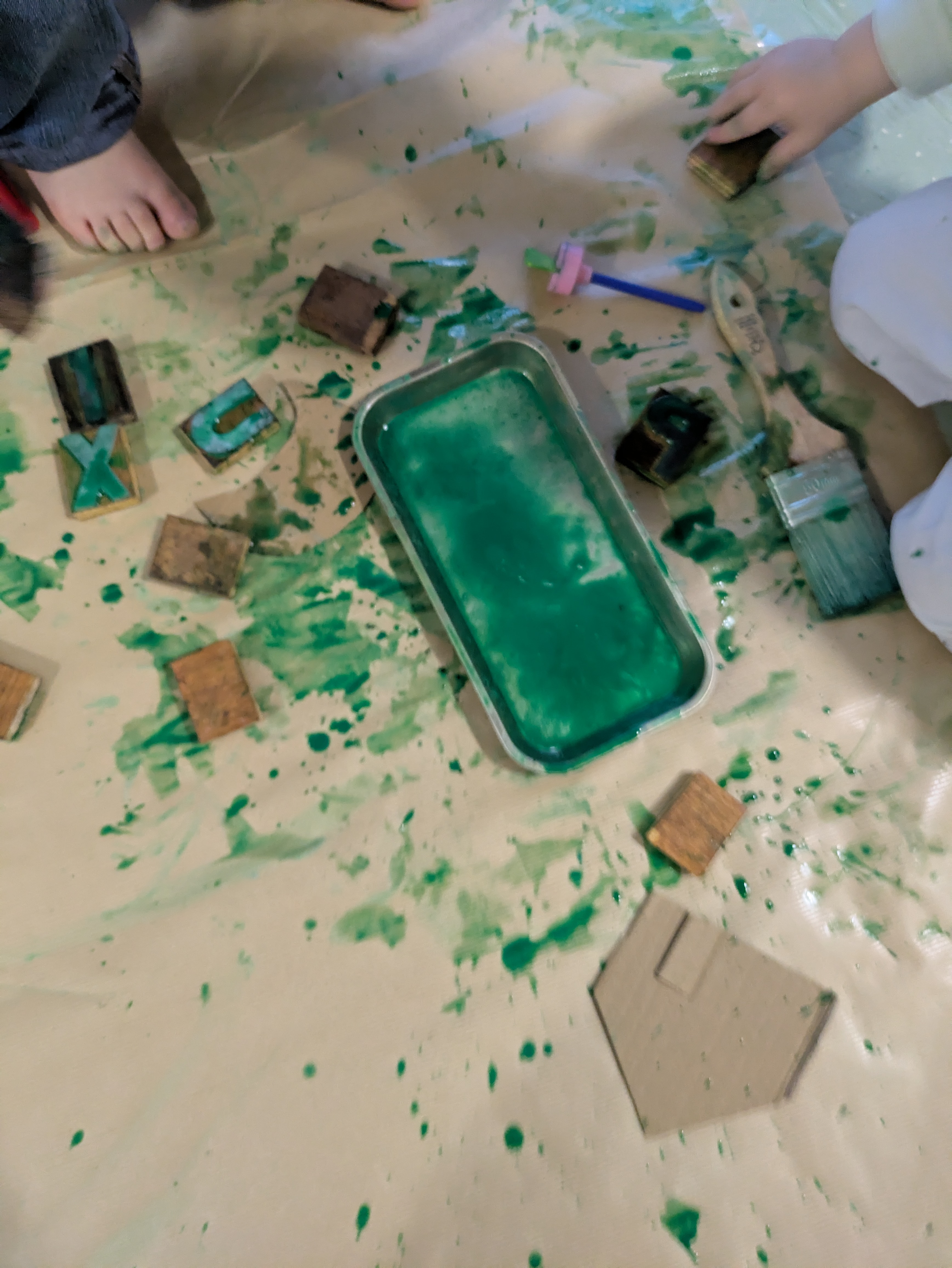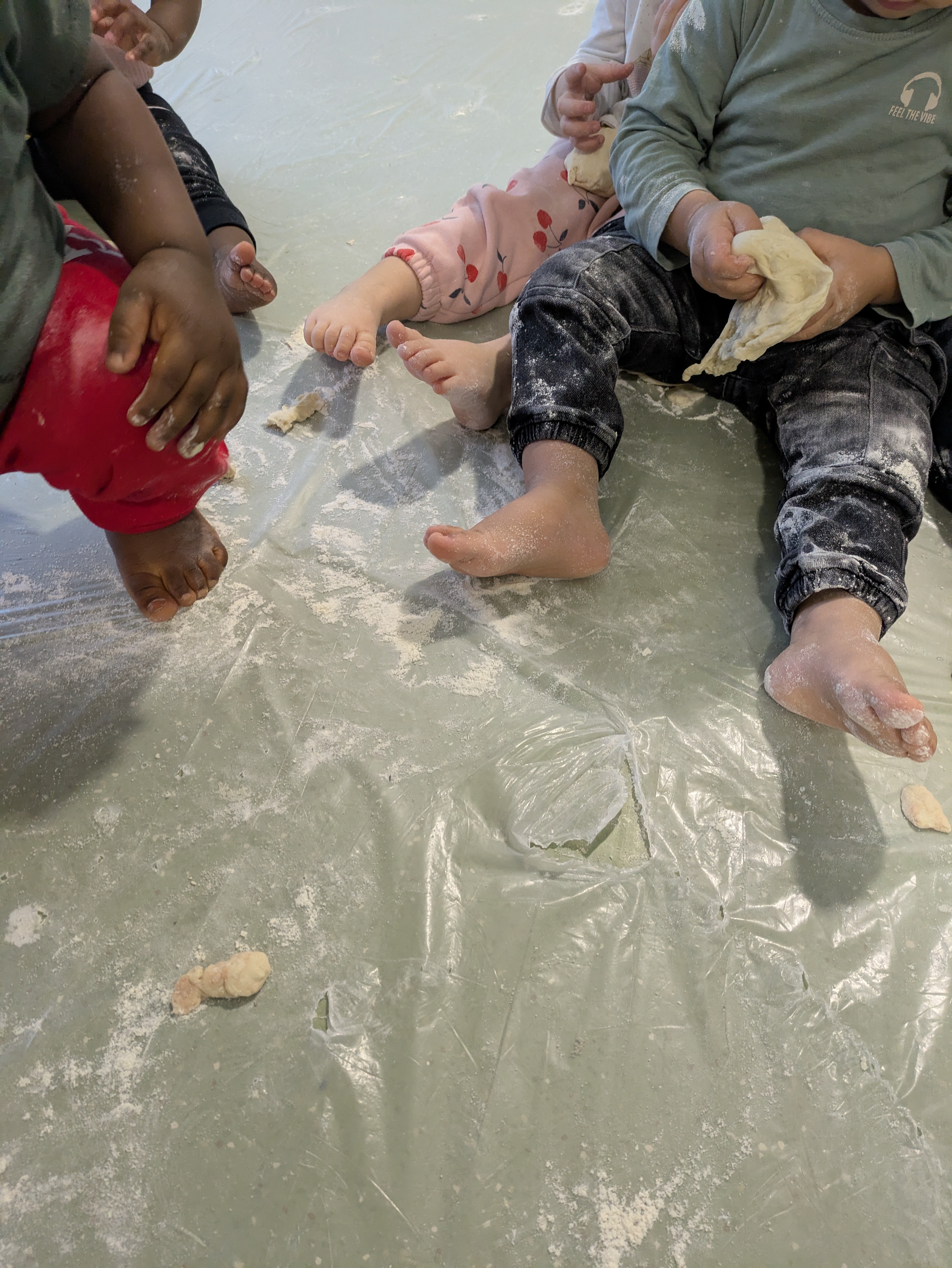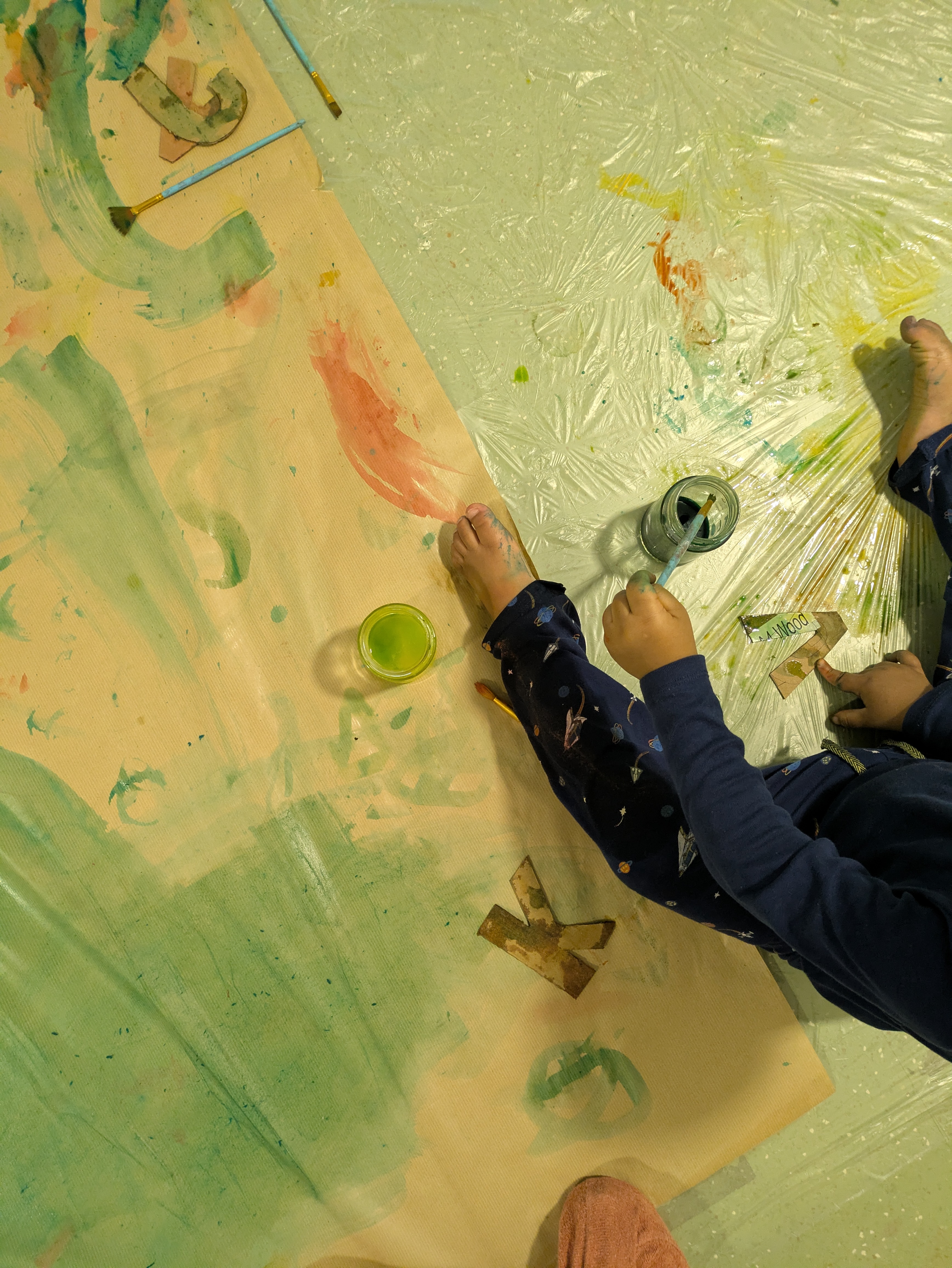 Au fil des semaines, les enfants ont expérimenté des pigments naturels, des textures et des formes, fabriqué et manipulé la pâte à sel, créé des empreintes, déchiré et collé des papiers, puis découvert les jeux de lumière et d’ombre. Chaque atelier était un espace d’experimentation où le corps, le regard et le langage étaient sollicités conjointement pour participer à la création, dans une approche respectueuse des rythmes et du développement de chacun.