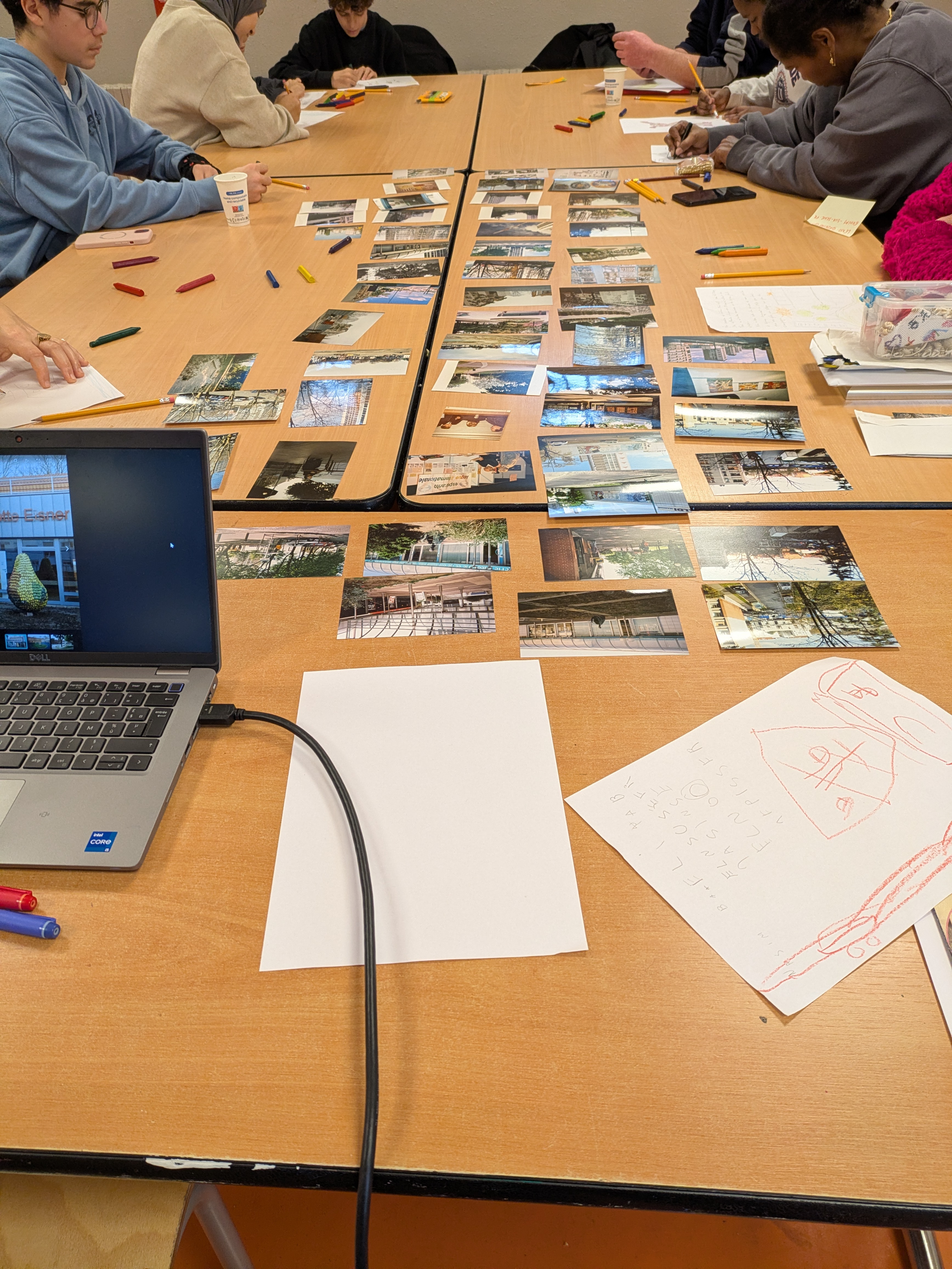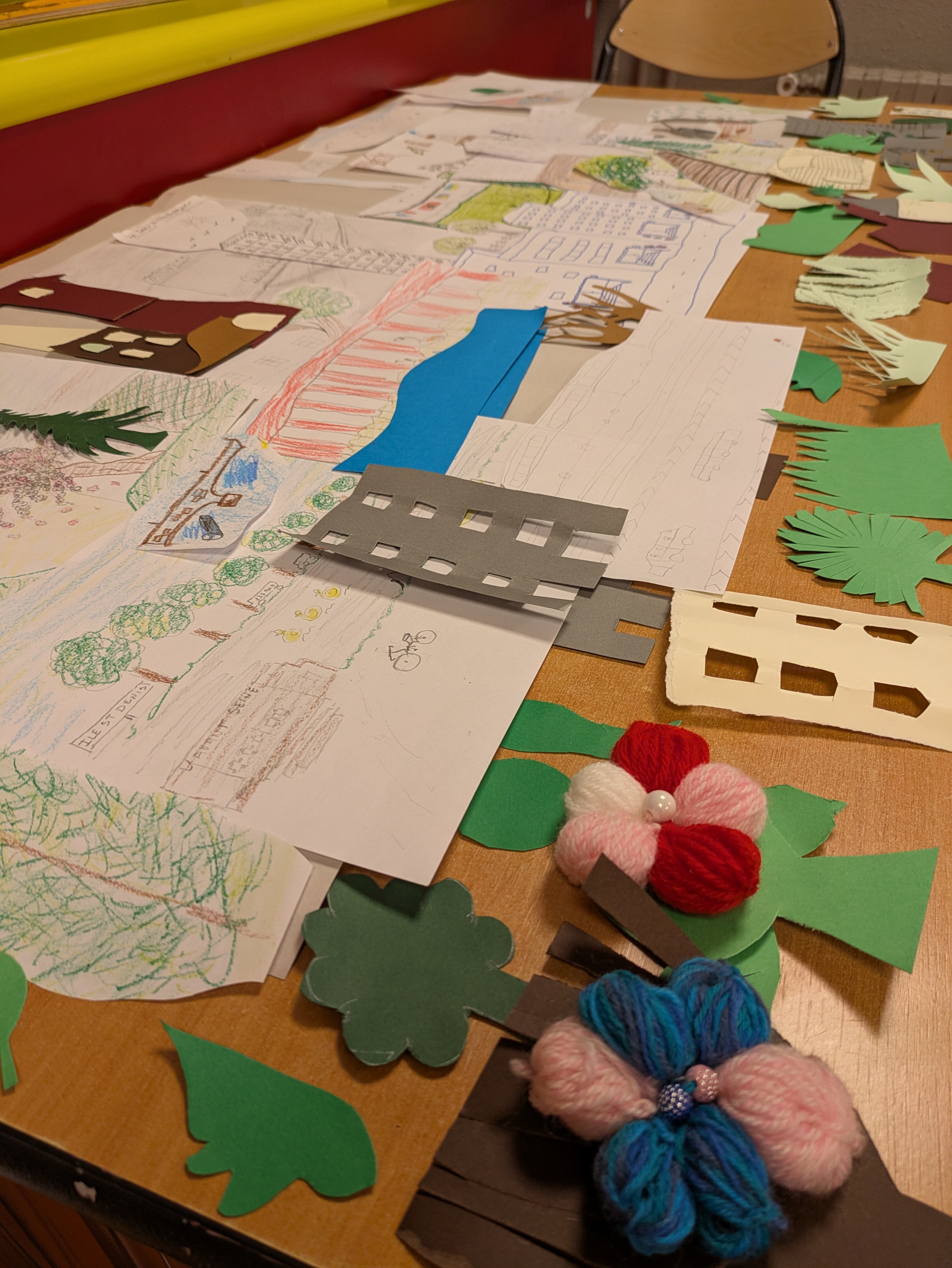 À partir de photographies prises par les participant·e·s, les premières séances ont été consacrées à l’observation, à l’analyse des images et à la collecte de souvenirs, de sensations et de points de vue. Ces échanges ont permis de sélectionner les éléments à représenter et de définir un langage visuel commun, mêlant architecture, paysages du quotidien, symboles personnels et motifs botaniques.